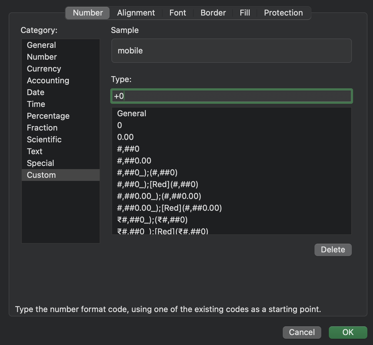 Next, select the last Custom option and in the Type field, put the +0 and hit Ok.